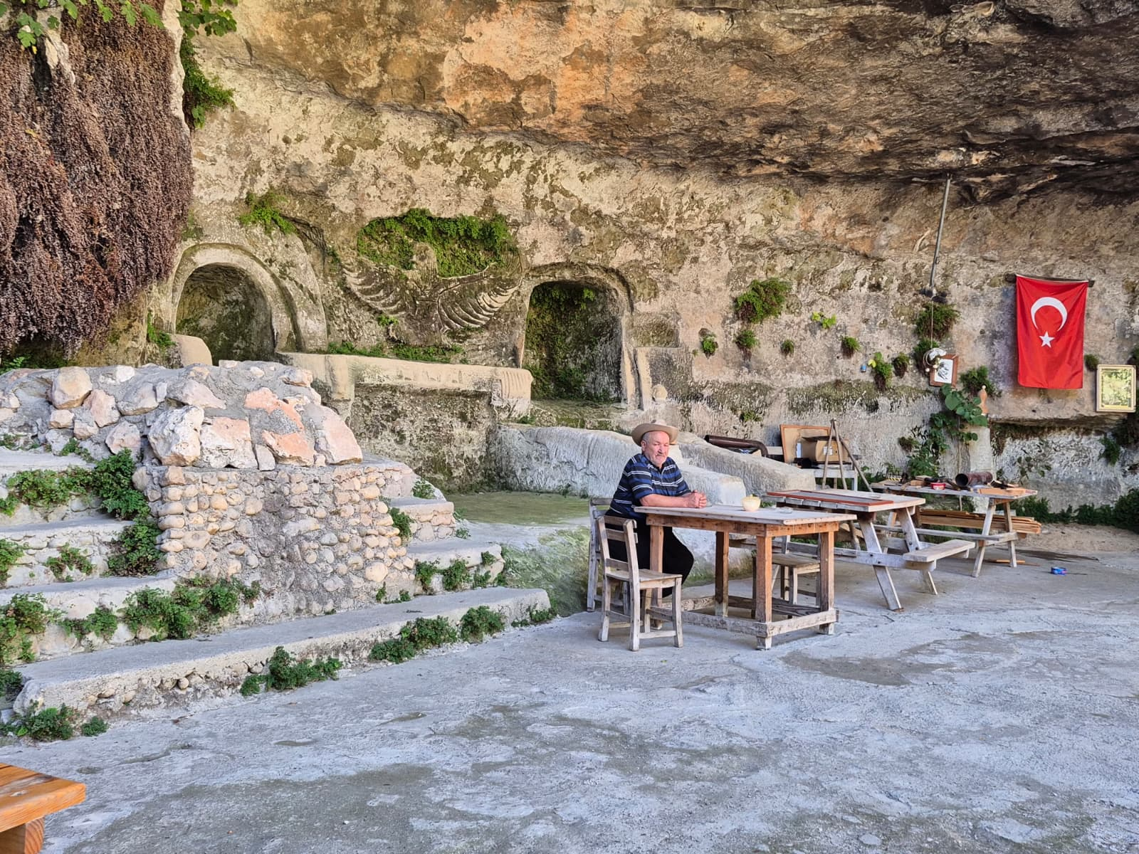Küçükken ailesine ait hayvanları otlatmak için geldiği Menekşe Mağarası civarında hep doğayla iç içe bir yaşamın hayalini kurduğunu anlatan Mustafa Öztürk, bu hayalini 35 yıl önce gerçekleştirdiğini söyledi. Yalnızlığı seçerek mağaraya yerleştiğinde, buranın çobanlar tarafından ağıl olarak kullanıldığını ve çok kirli olduğunu aktaran Öztürk, “Temiz bir çalışma sonrasında mağarayı yaşanabilir bir hâle getirdim.” dedi. Günlerini kedisi, köpeği ve kuşlarıyla geçirdiğini ifade eden Öztürk, hayvanlarıyla birlikte bu doğal ortamda sükûnet bulduğunu açıkladı.